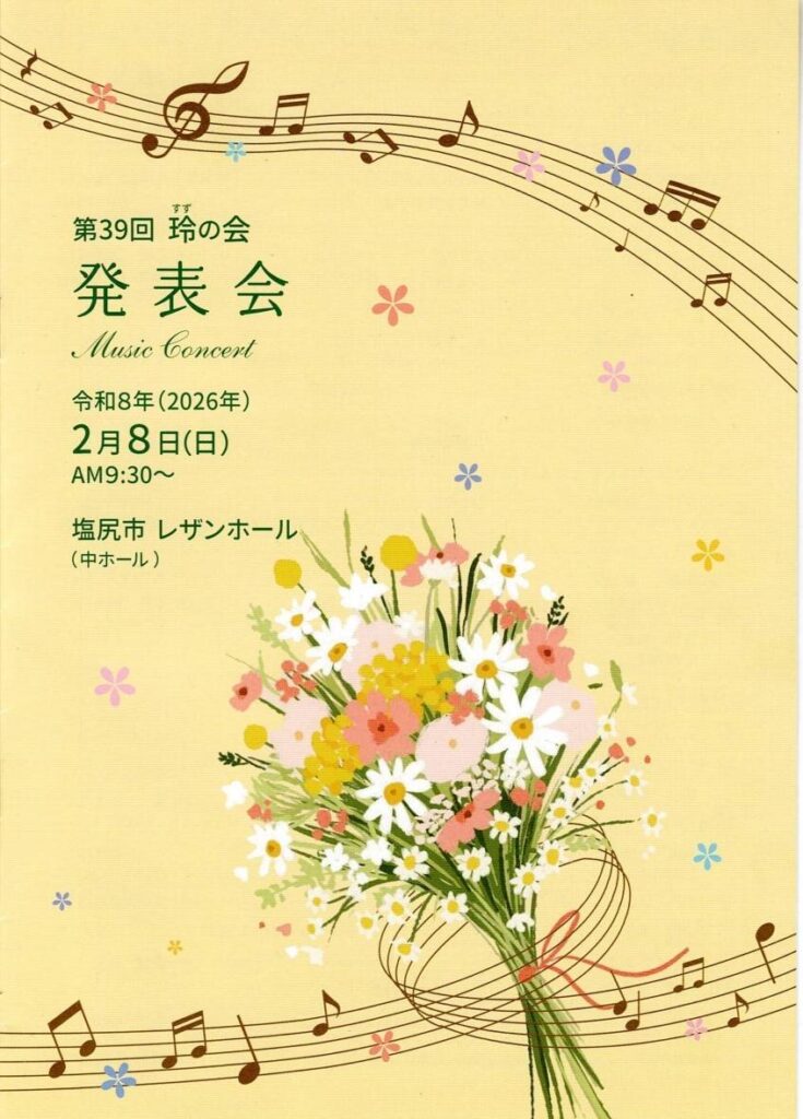 2026.01.29 第39回玲の会発表会 2月8日(日)塩尻市レザンホール中ホールにて、『第39回 玲の会 発表会』を開催いたします♫ 今年のテーマは『Flower~花~』 様々な花言葉に一人ひとりの想いをのせて届けます。 色とりどりに輝く個性豊かなステージをお楽しみください! お気軽にお越しください!