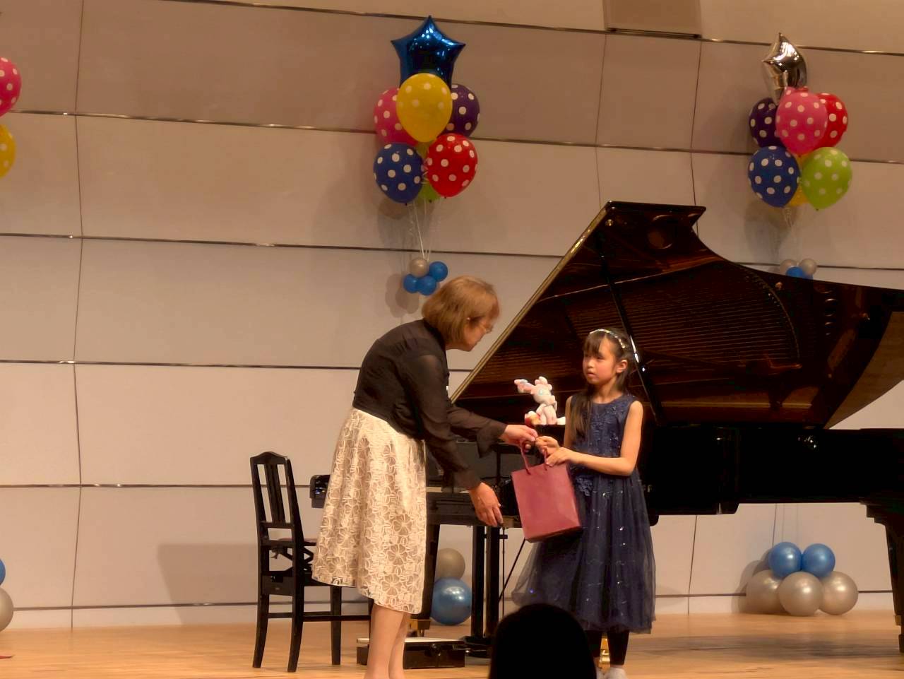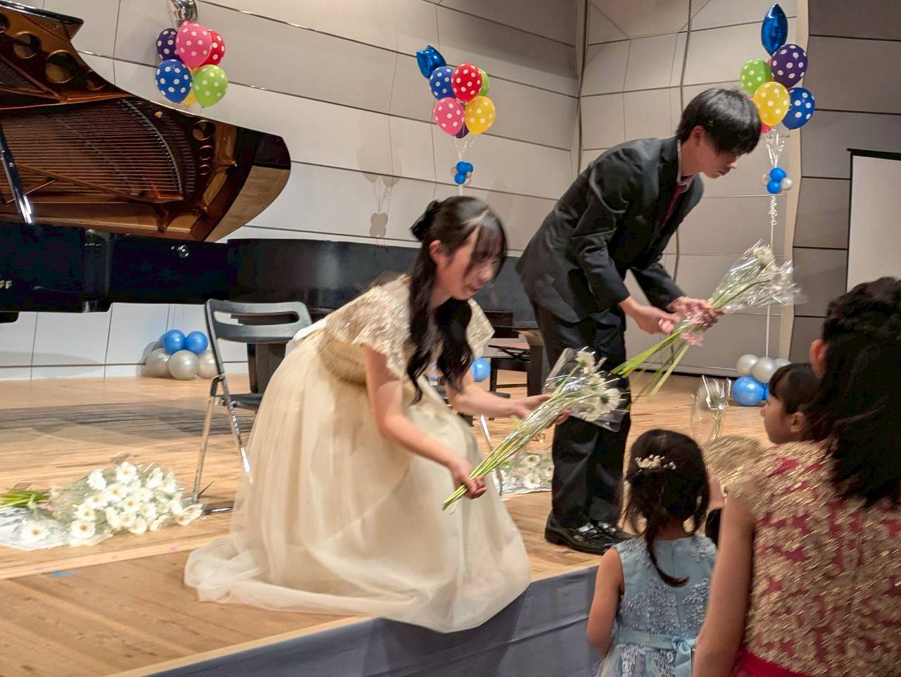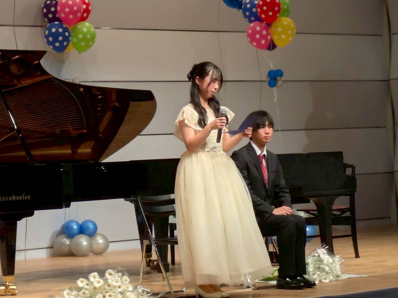 特に伊那教室は、中高生が中心となり、会を運営、進行していきます。小さな子どもたちも、大きいお兄さん、お姉さんの姿を見て応援、成長していきます。今回は、高校を卒業する生徒さん2名の「卒業コンサート」も開催。教室でのお二人の軌跡が紹介され、先生方からはなむけの言葉が送られる感動のセレモニー。お二人の演奏、最後に、全員からお花を1輪ずつプレゼント。会場から盛大な拍手が送られましたよ。
